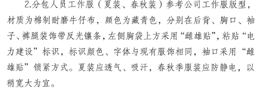 电力工程工作服,夏季以及春秋装都是需要采用长袖的款式,上衣和裤子的纽扣都是采用树脂的纽扣不能是金属的纽扣,在衣服的前后以及后背,袖口以及裤脚处都是加反光条的处理,在衣服的左胸处缝制魔术贴,魔术贴上刺绣上公司的LOGO。