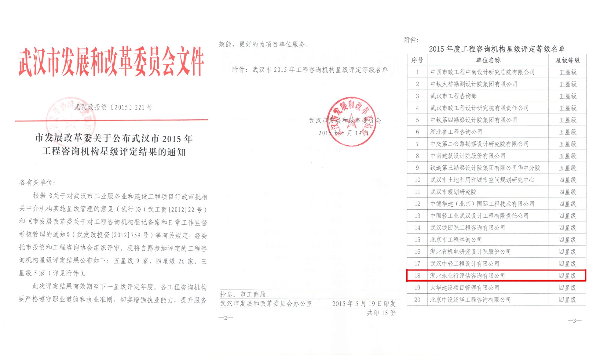 近日,武汉市发改委公布了武汉市2015年工程咨询机构星级评定结果,永业行被评为四星级工程咨询机构。