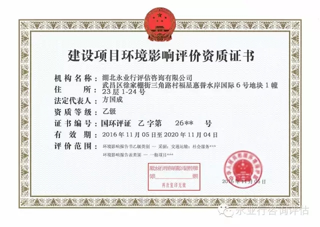 近期,永业行环境影响评价资质(乙级)顺利通过环保部资质延续审查,资质延续申请获中国环境保护部批准。环境影响评价资质(乙级)延续批准评价范围为一般项目环境影响报告表和采掘、社会服务、交通运输类环境影响报告书(乙级)。资质有效期自2016115日至2020114日。