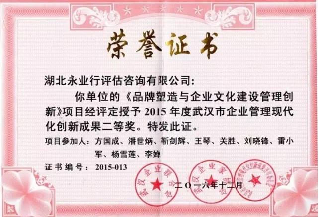 近日,永业行获得武汉市第29届(2015年度)企业管理现代化创新成果二等奖