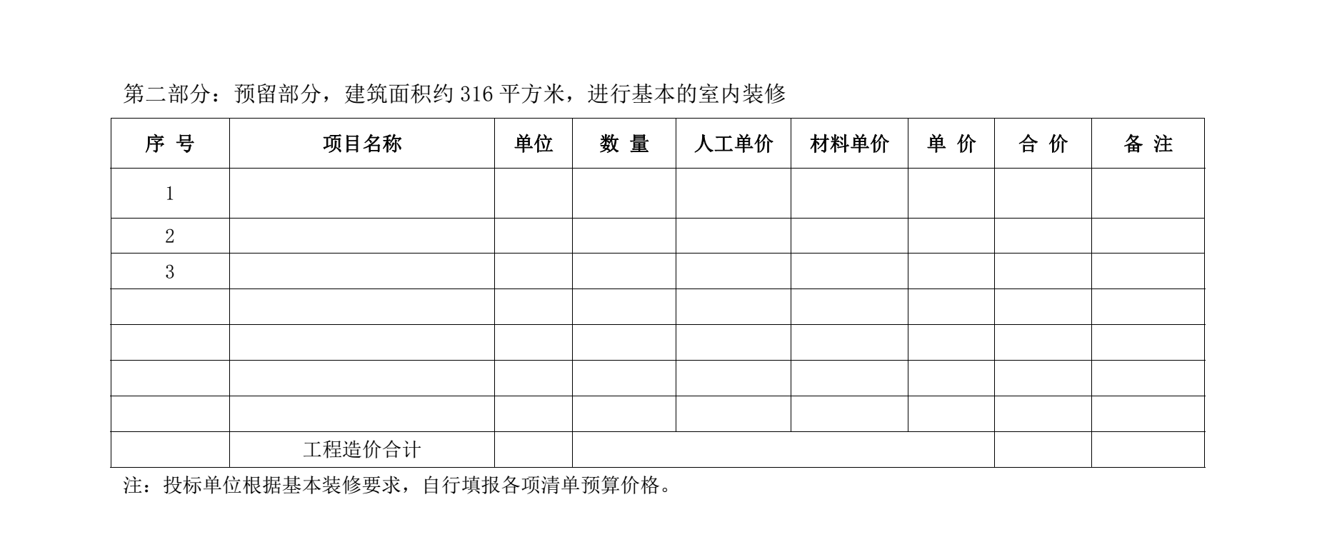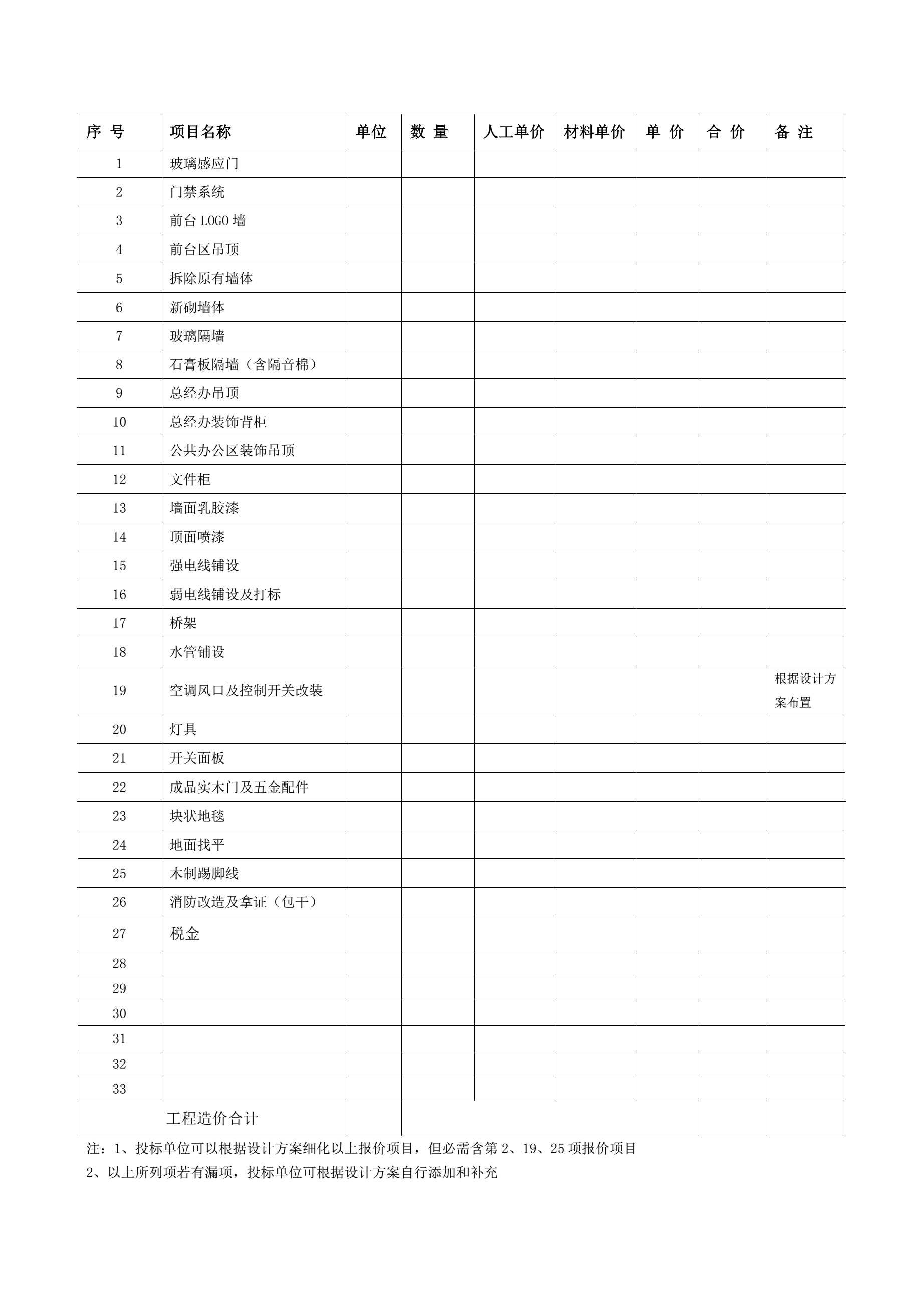 本次采购范围为半包方式,包含但不限于前台、会议室、办公区域等,包含上述采购内容的全部工作,其它未包含部分供应商可另附建议、报价及清单,各供应商应严格按照谈判文件及所附工程量清单分项进行报价,对于本次采购范围内的漏(错)项,采购人在投标文件中可予以调整,一经谈判确认后,严格按此价格进行结算,后期若有漏项,采购人对结算价格将不予调整。