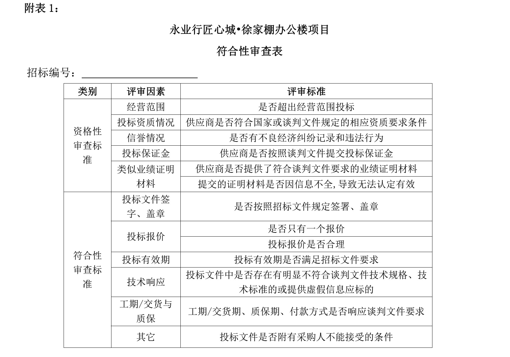 ⑵ 符合性检查:依据招标文件规定,从投标文件的有效性、完整性和对招标文件的响应程度进行审查,以确定是否对招标文件的实质性要求作出响应;实质上没有响应招标文件要求的投标将被拒绝(详细内容详见附表1)。