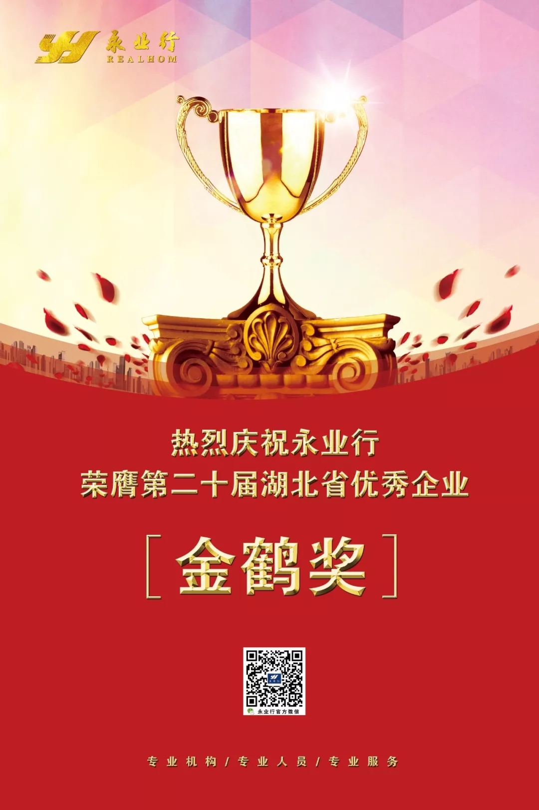 9月19日,湖北省企业联合会、湖北省企业家协会在武汉市洪山宾馆召开2019湖北企业百强发布会、第二十届湖北省优秀企业、优秀企业家表彰大会。湖北省政府国资委党委书记、主任傅立民,原省国资委主任、原省企业联合会、省企业家协会会长邱思胜出席会议并讲话。永业行荣获“2019湖北服务业企业100强”及“第二十届湖北省优秀企业(金鹤奖)”称号,是湖北省评估咨询行业唯一一家上榜企业。