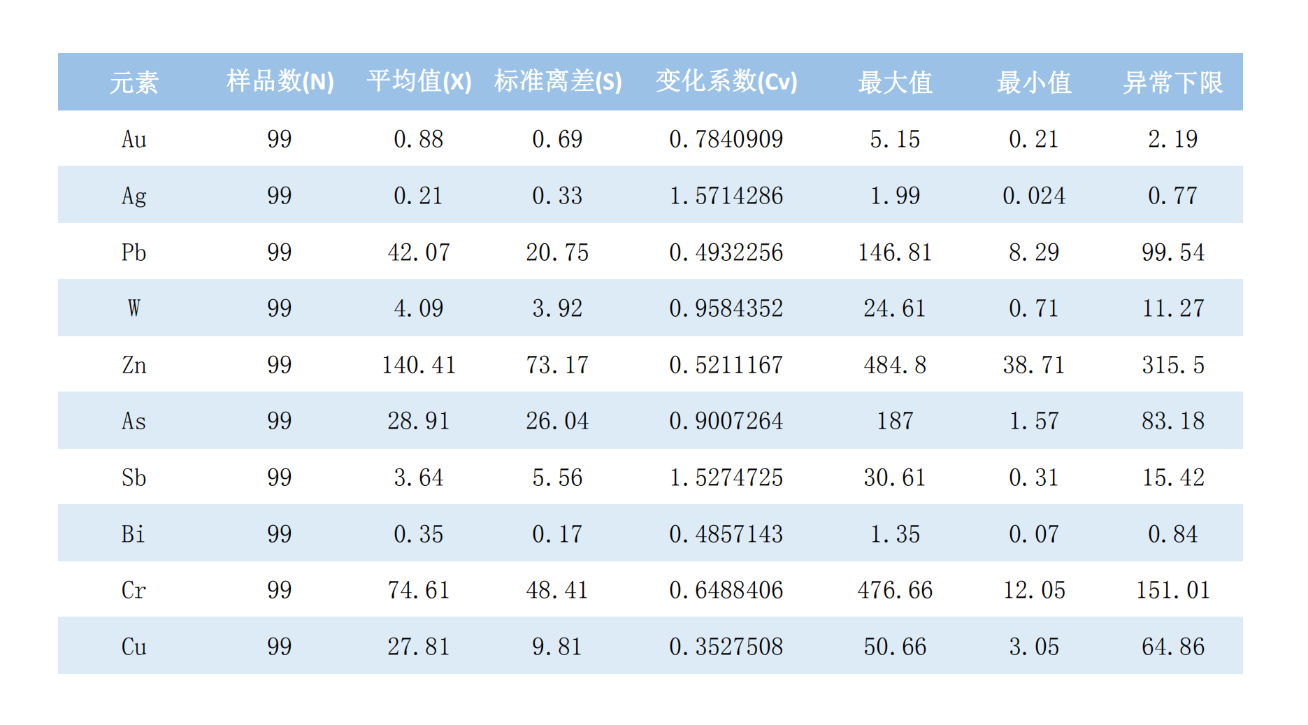 (1)均匀分布型(CV﹤0.3):Cu,说明其基本不受后期地质地球化学作用。