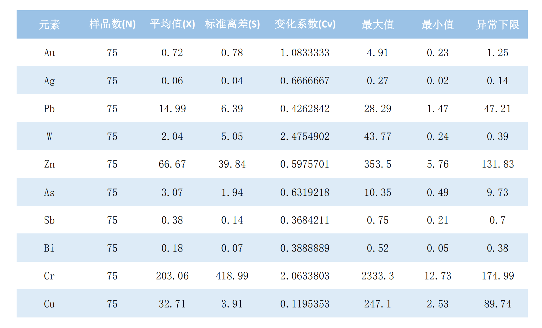 将地化剖面上10个元素剔除前的变化系数值(Cv)大小分为均匀分布(CV﹤0.3)、中等起伏(0.3﹤CV﹤0.6)、较大起伏(0.6﹤CV﹤1.2)、很大起伏(1.2﹤CV﹤2.4)、极大起伏(CV>2.4)。