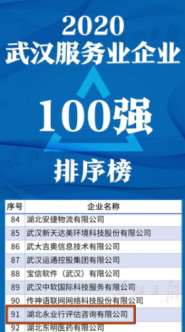 2020年9月25日,2020武汉企业100强、武汉制造业企业100强、武汉服务业企业100强正式发布,永业行凭借良好的发展态势和经营业绩,上榜2020武汉服务业企业百强榜单,这是继2018年、2019年获得“武汉服务业企业100强”后,永业行又一次获此殊荣。