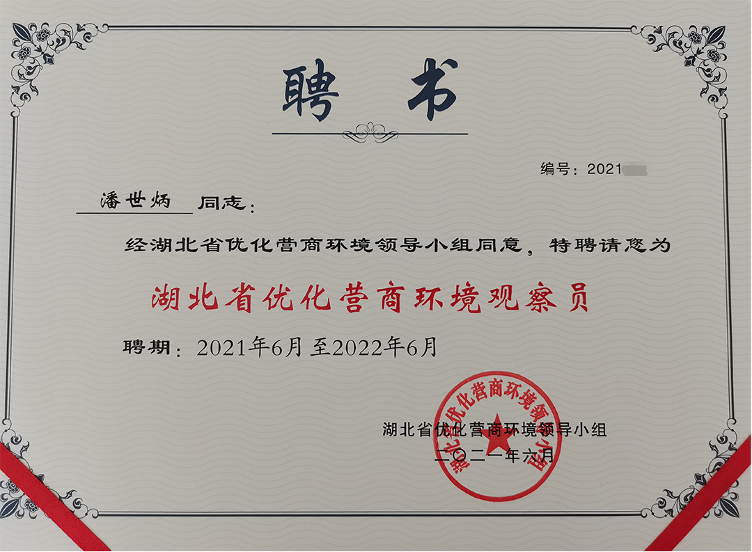 永业行潘世炳受聘为湖北省首批优化营商环境观察员