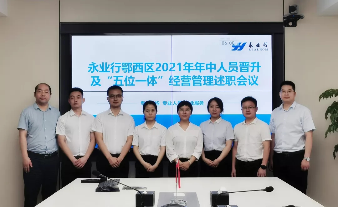 7月16日,永业行举办鄂西区2021年年中人员晋升及“五位一体”经营管理述职会,轮值总裁王琴、副总裁吴学锋、助理总裁兼鄂西区总经理雷小明,部门负责人及员工代表,鄂西区述职员工等参加会议。
