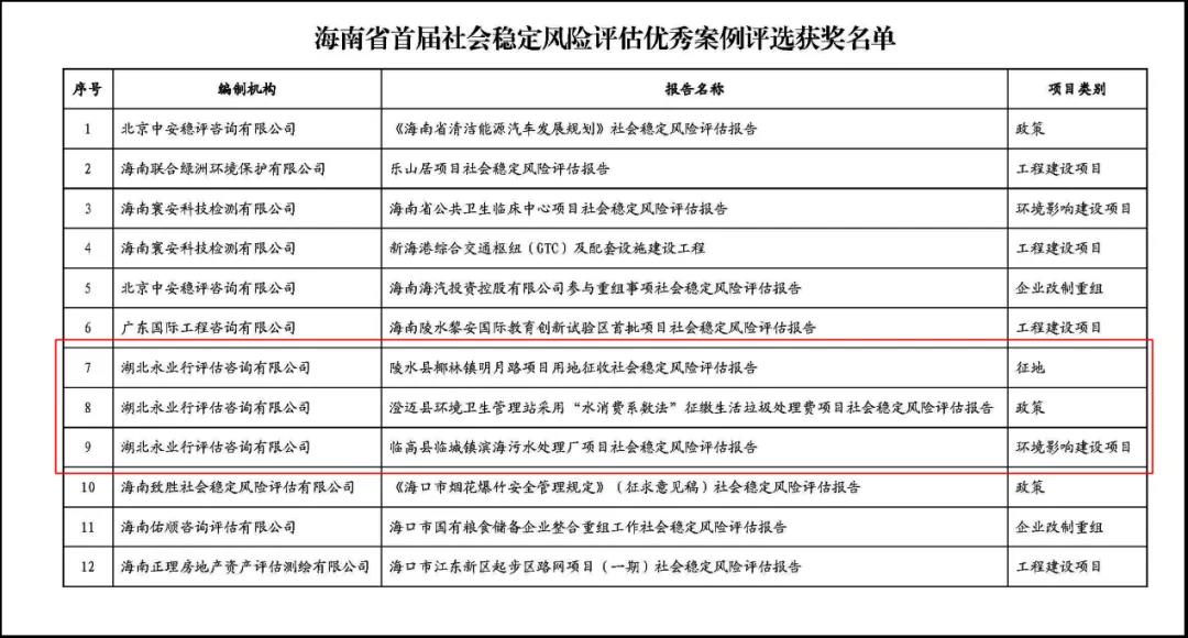 近日,海南省社会风险评估研究中心公布了海南省首届社会稳定风险评估优秀案例,共计评选出12个获奖报告。由永业行申报的3个报告全部获评优秀案例,分别是《陵水县椰林镇明月路项目用地征收社会稳定风险评估报告》《澄迈县环境卫生管理站采用“水消费系数法”征缴生活垃圾处理费项目社会稳定风险评估报告》《临高县临城镇滨海污水处理厂项目社会稳定风险评估报告》。