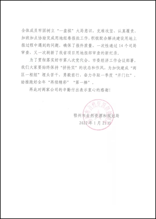 岁末年初,永业行陆续收到国家石油天然气管网集团有限公司武汉输气分公司、湖北交投孝汉应高速公路有限公司及鄂州市自然资源和规划局发来的感谢信。信中对永业行以高质量、高效能提供的技术服务,以及展现出的永业行人的责任和担当予以肯定和表扬。满载的赞赏和鼓励,既是对项目团队辛勤付出的高度认可,亦是对公司品质履约的充分肯定。