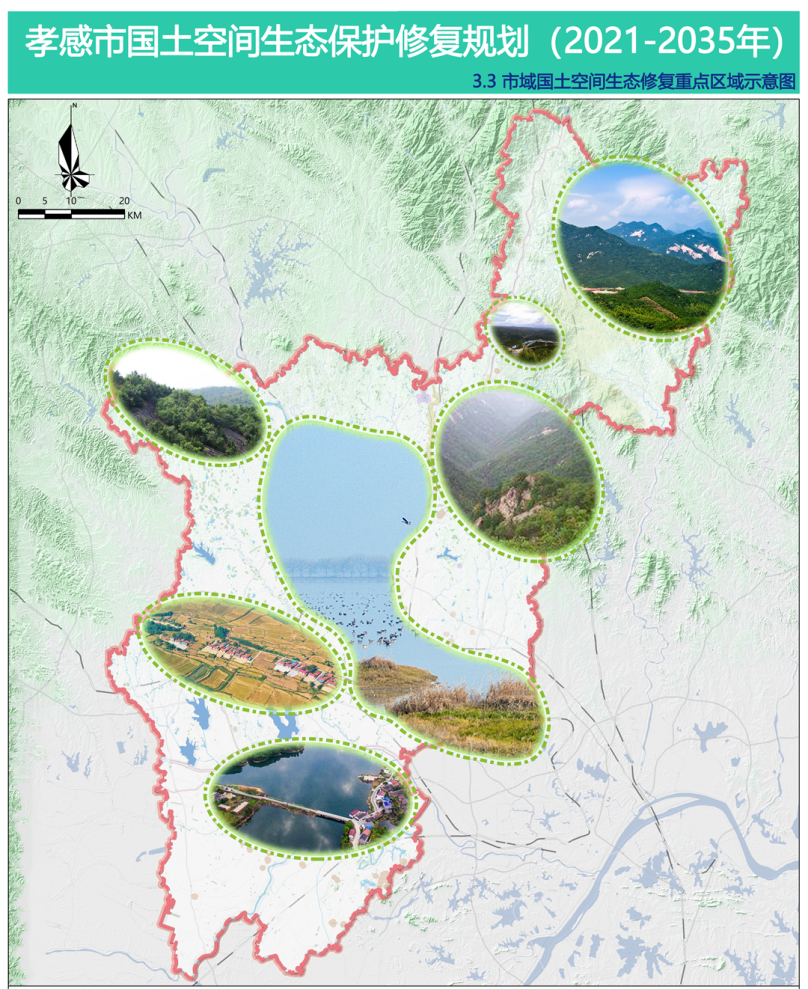 围绕打造“山青、水绿、田沃、湖净、城美”的魅力孝都的总体目标,构建“两屏四廊一园多点”的生态保护修复总体格局。