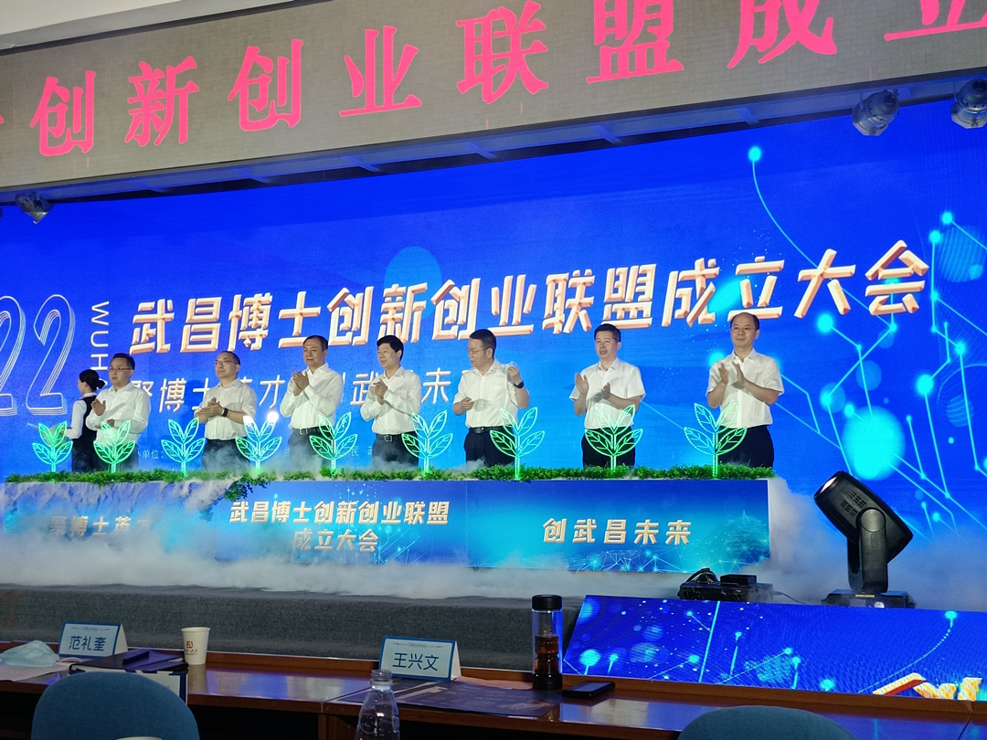 中共武昌区委书记余松致辞后,由中共湖北省委组织部副部长王炜、武汉市委组织部副部长姜铁兵,武昌区区委书记余松、区长范礼奎等领导一起按下启动按钮,宣布武昌博士创新创业联盟成立。 ​