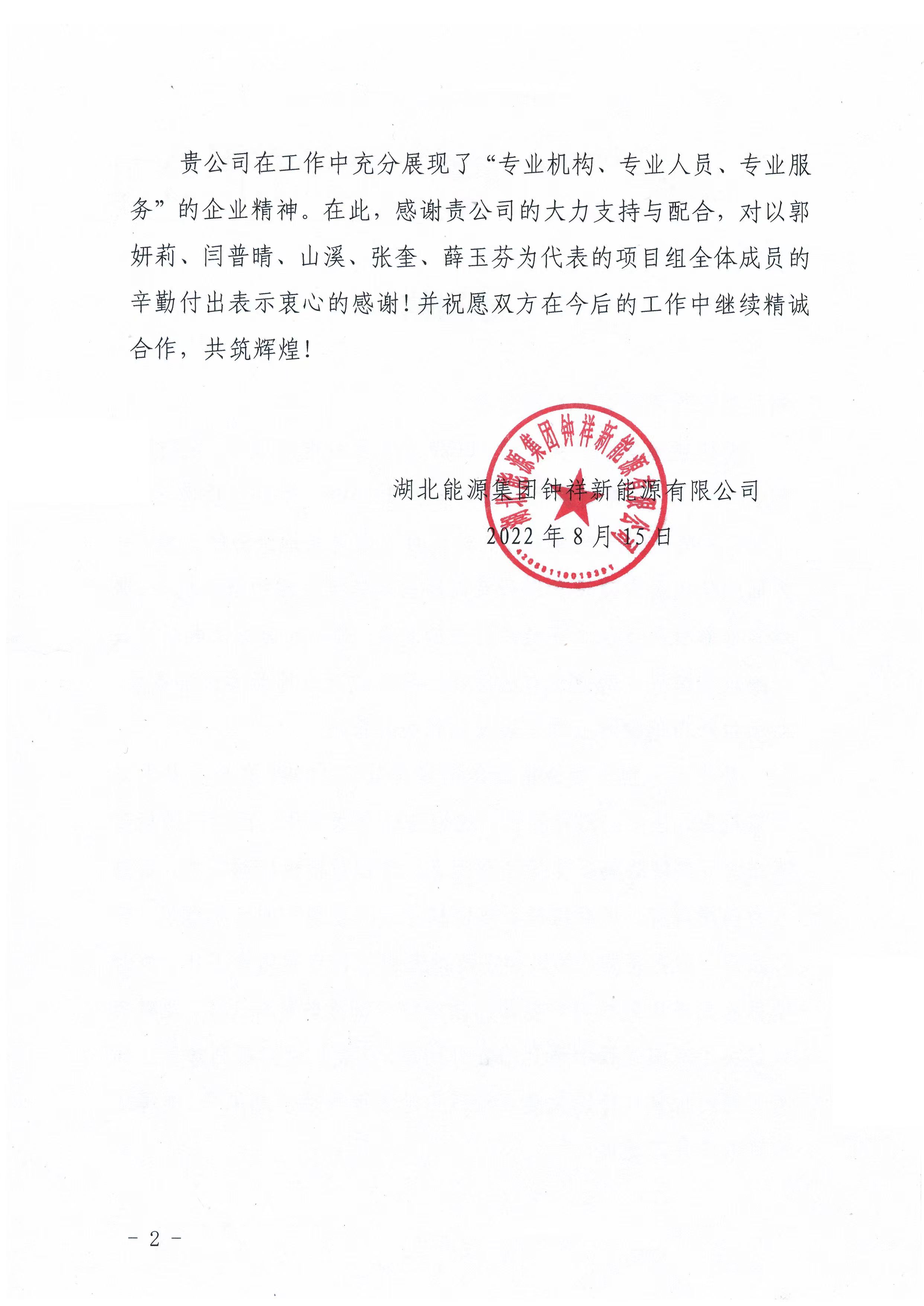 永业行获湖北能源集团钟祥新能源有限公司致函感谢