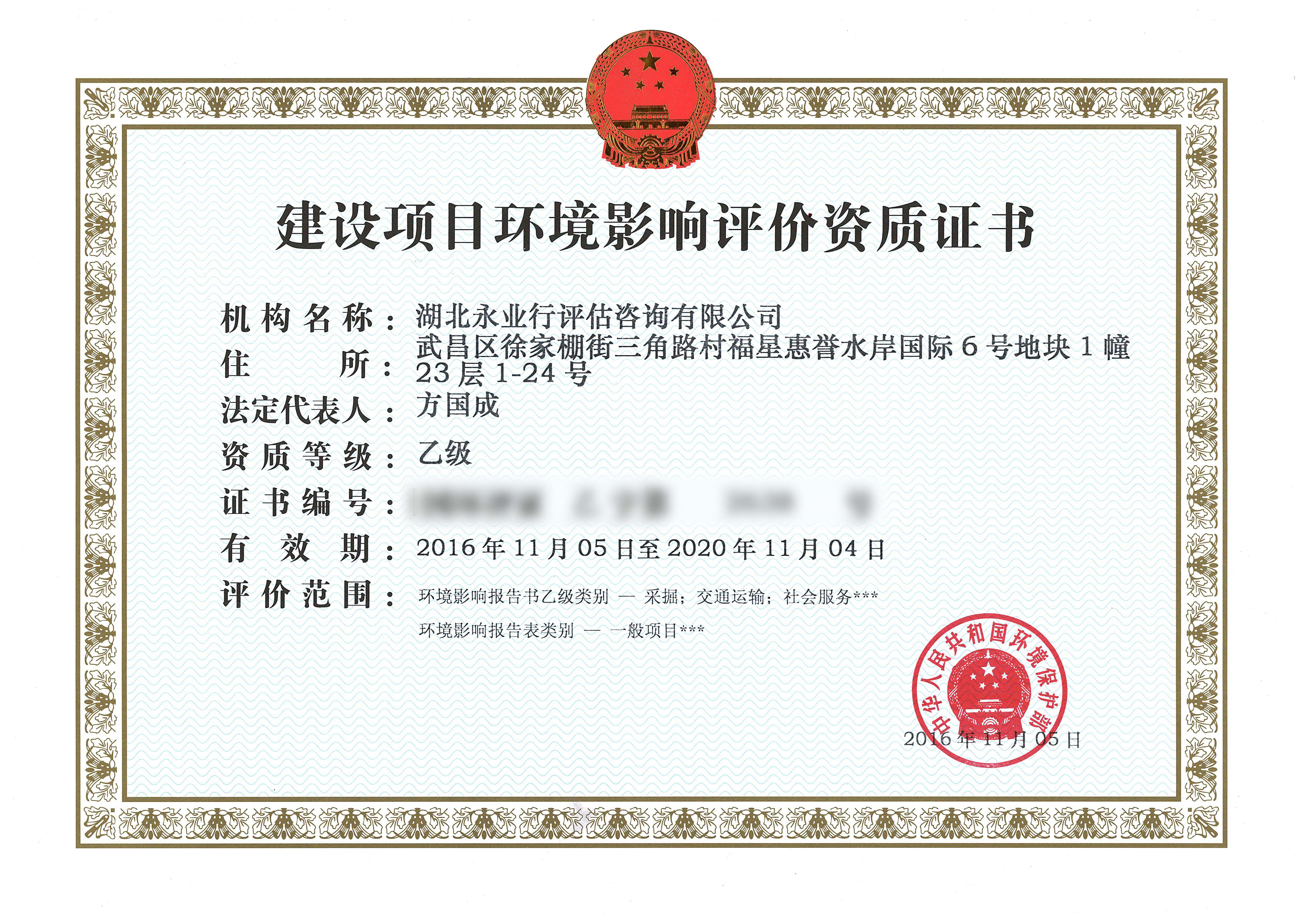 建设项目环境影响评价乙级资质证书