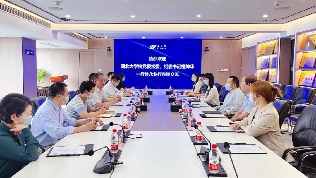 潘世炳对檀坤华一行的到来表示热烈欢迎,他代表公司对湖北大学培养并输送了大批专业务实、笃志笃行的人才表示衷心感谢。并从发展历程、业务布局、党团建设、内部管理、校企合作、发展规划等方面介绍了永业行经营管理情况。他提出需充分发挥学校和企业各自优势,建立互利共惠、可持续合作关系,共同在专业领域达成更高建树,实现共赢。希望以本次交流为契机,在人才引进、研发创新等方面深入合作。