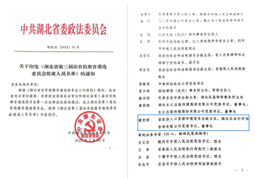 永业行潘世炳受聘为第三届湖北省法官检察官遴选委员会专家委员