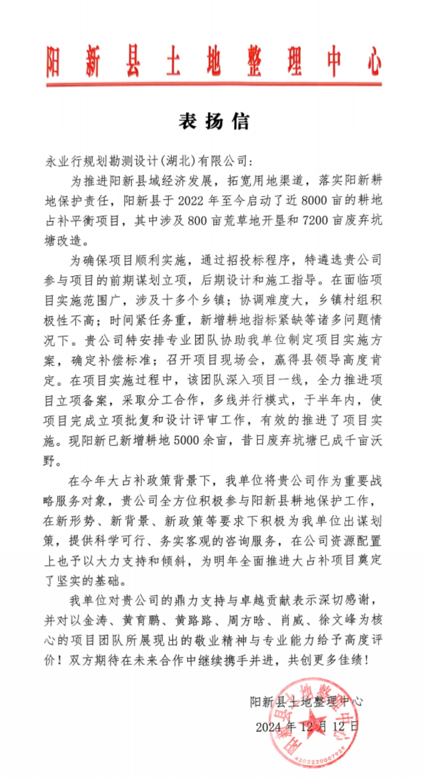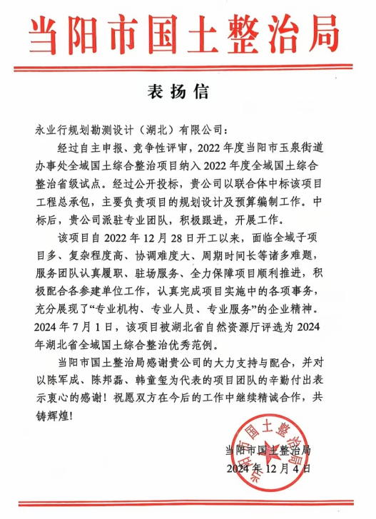近期,永业行陆续收到了当阳市国土整治局、阳新县土地整理中心、黄石锦湖生态旅游发展有限公司等多封表扬信。信中充分肯定了我司“专业机构、永业行、专业服务”的企业精神,表达持续精诚合作的美好意愿,并给予我司事业蓬勃发展,再创佳绩的良好祝愿。