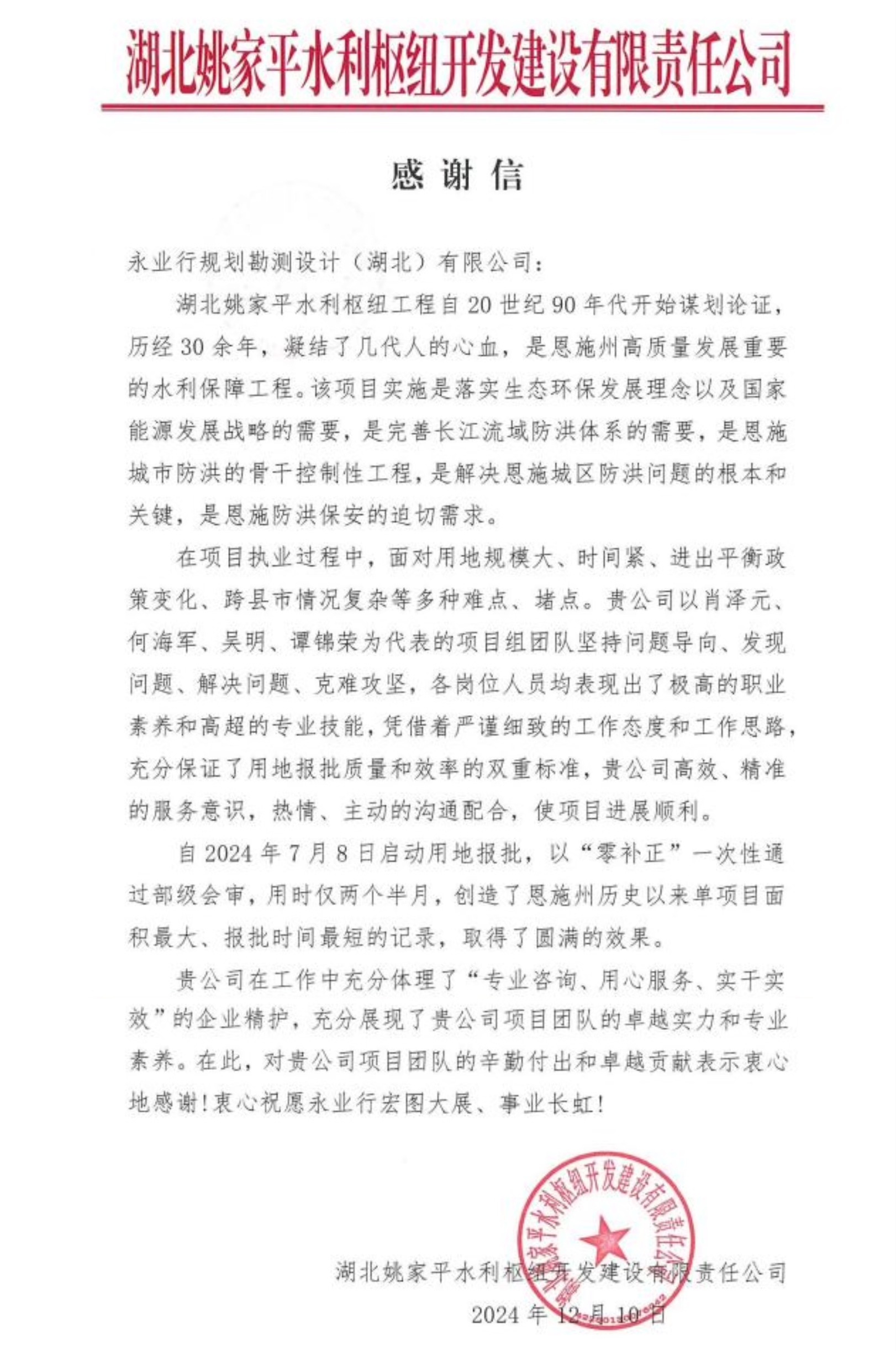 感谢信称,湖北姚家平水利枢纽工程是恩施州高质量发展的重要水利保障工程,凝结了几代人的心血,该项目在执业过程中面临诸多难点,如用地规模大、时间紧、政策变化复杂等,永业行鄂西区以肖泽元、何海军、吴明、谭锦荣等为代表的项目团队凭借严谨细致的工作态度和和工作思路充分保证了用地报批质量和效率的双重标准,最终以“零补正”一次性通过部级会审,创造了恩施州单项目面积最大、报批时间最短的记录。