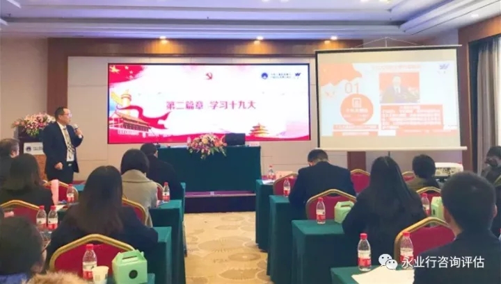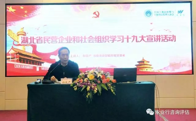 12月10日,永业行组织召开党的十九大精神宣讲报告会。湖北省民营企业和社会组织宣讲队队员:省委统战部新阶层处处长郝俊严和永业行总裁潘世炳,对党的十九大精神进行了宣讲。省内多个市州有关单位及永业行总部、各分部党员和估价师等近200人参加了学习。