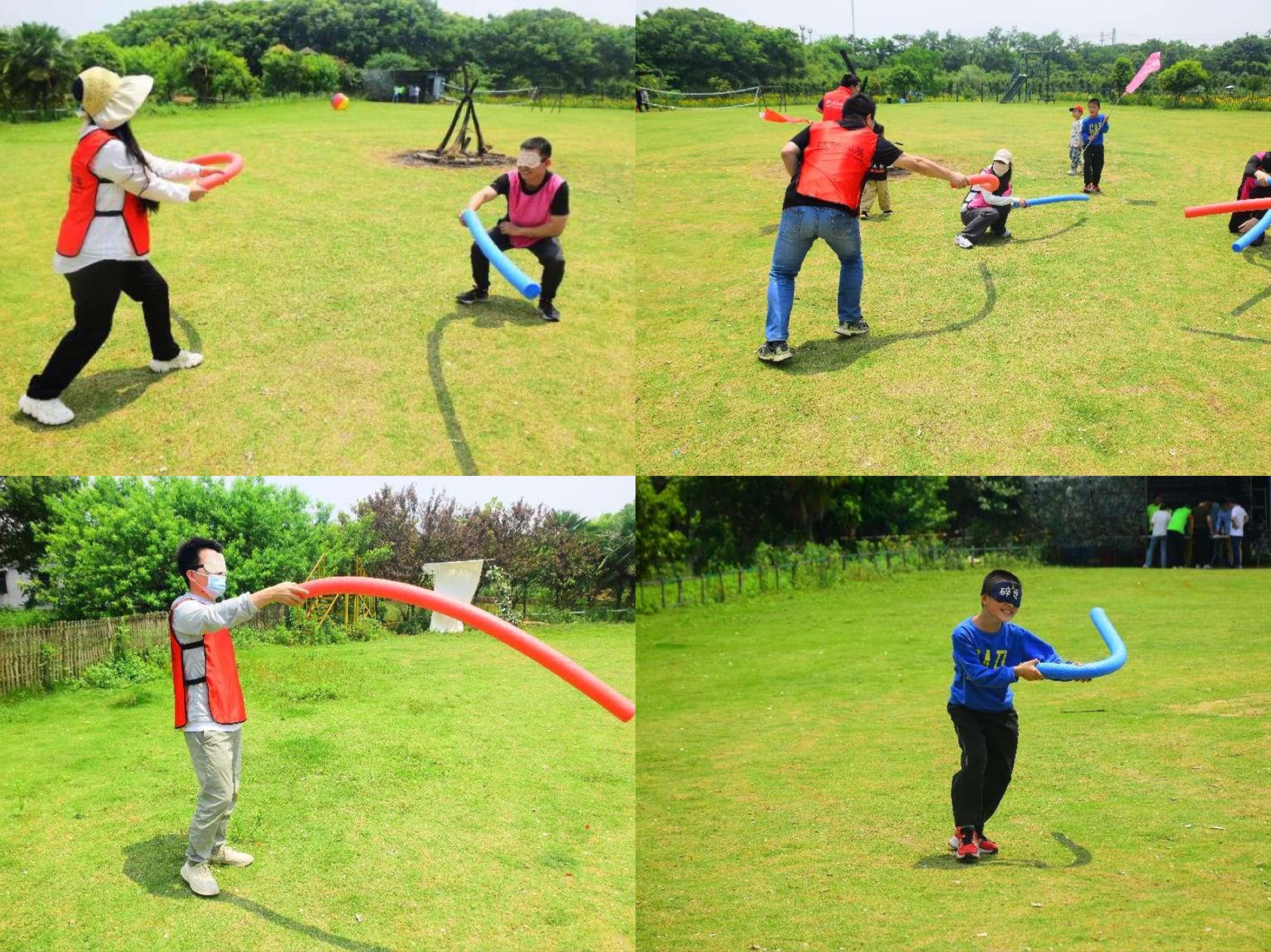 当蒙住眼睛只能靠听觉来行动时,队友之间是否有足够的信任来配合完成任务呢?每队每次排出两名“蒙眼大侠”,手持道具的剑,听从自己组员的指令行动,首先击中对手身体的任何部位为胜利。混乱的场地中,努力分辨来自队友的指令,最终两队打成平手,充分享受游戏乐趣。