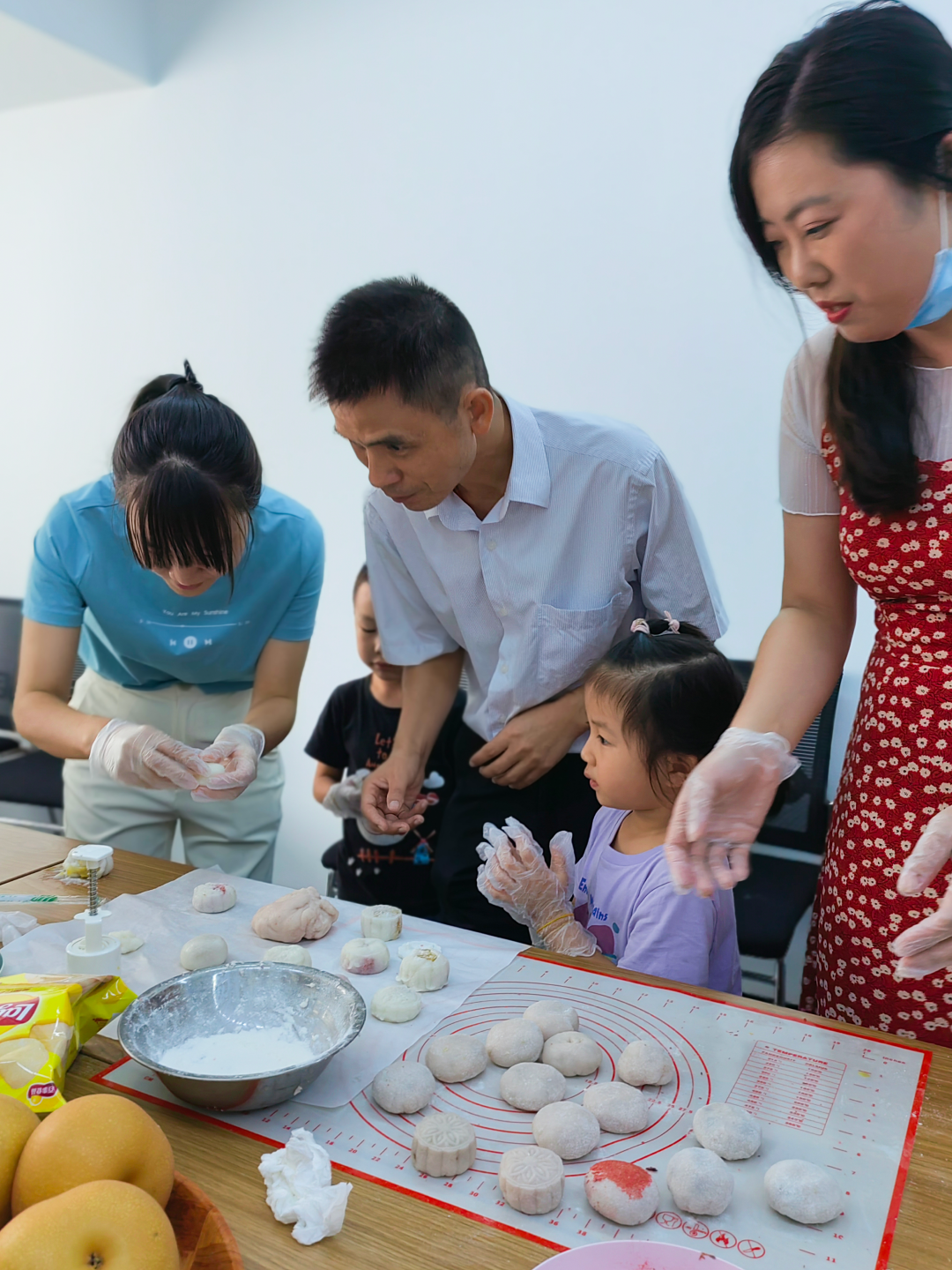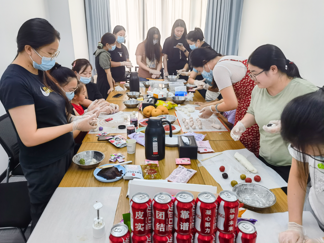 在轻松的氛围中,大家兴味盎然的参照月饼制作教学视频,相互指导帮忙,按照步骤逐步和面、揉团、擀皮、裹陷、压型……在大家慧心巧思地制作下,一个个小巧玲珑、芳香四溢的月饼逐步成型,让制作者成就感十足。