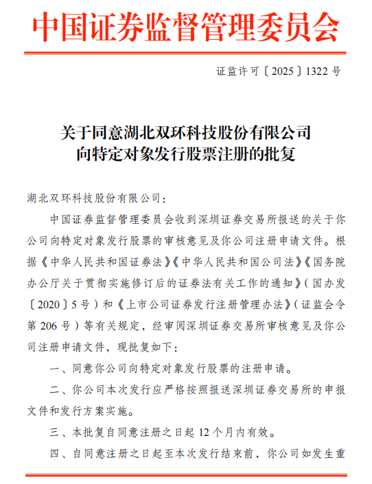 2025年6月27日,湖北双环科技股份有限公司(以下简称“双环科技”)(股票代码:000707)获得中国证券监督管理委员会(以下简称“中国证监会”)出具的《关于同意湖北双环科技股份有限公司向特定对象发行股票注册的批复》(证监许可〔2025〕1322号),获准向特定对象发行股票的注册申请。