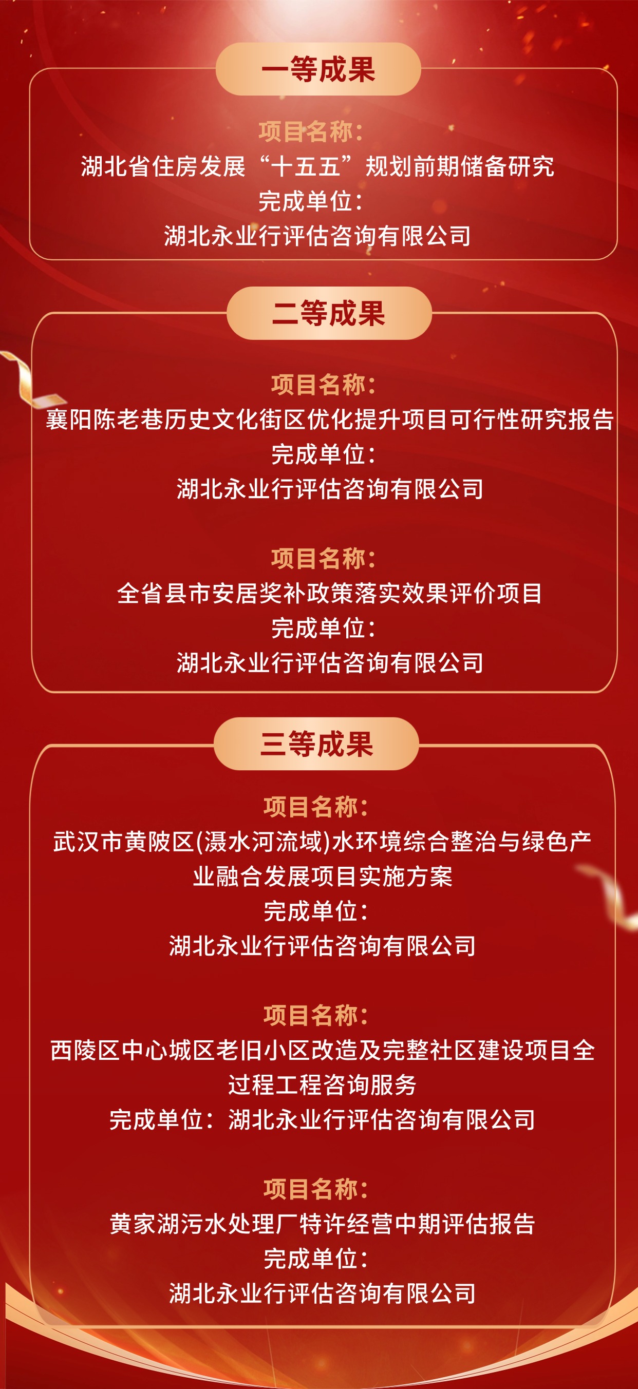 近日,湖北省工程咨询协会发布2025年湖北省工程咨询成果评价结果的公告,永业行凭借深厚的专业功底与创新的咨询理念,共有6项成果获得优秀评价。